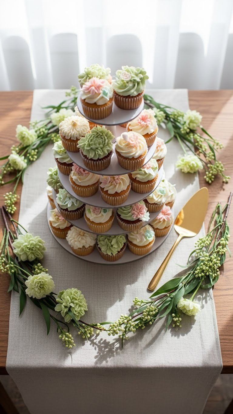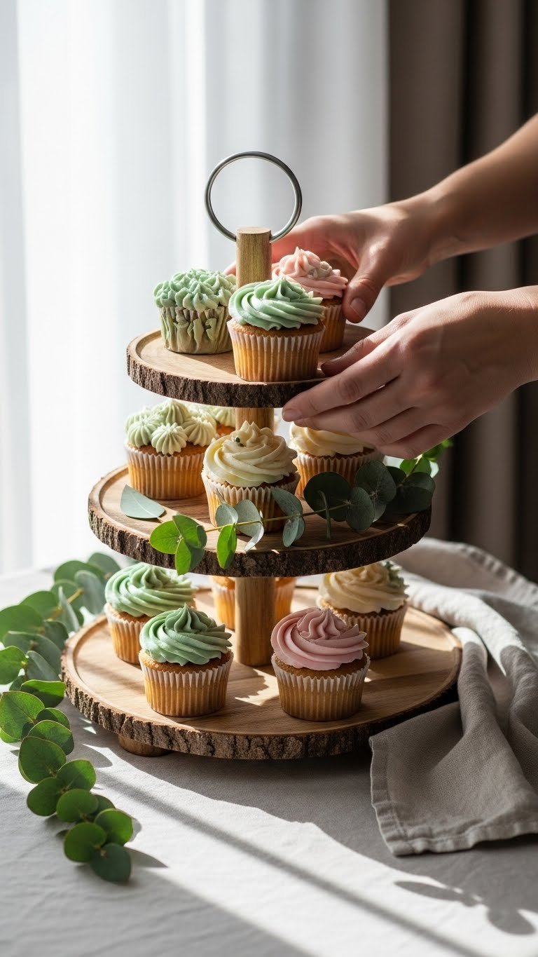- Add small clusters of flowers and eucalyptus between cupcakes—use non-toxic blooms or floral picks.