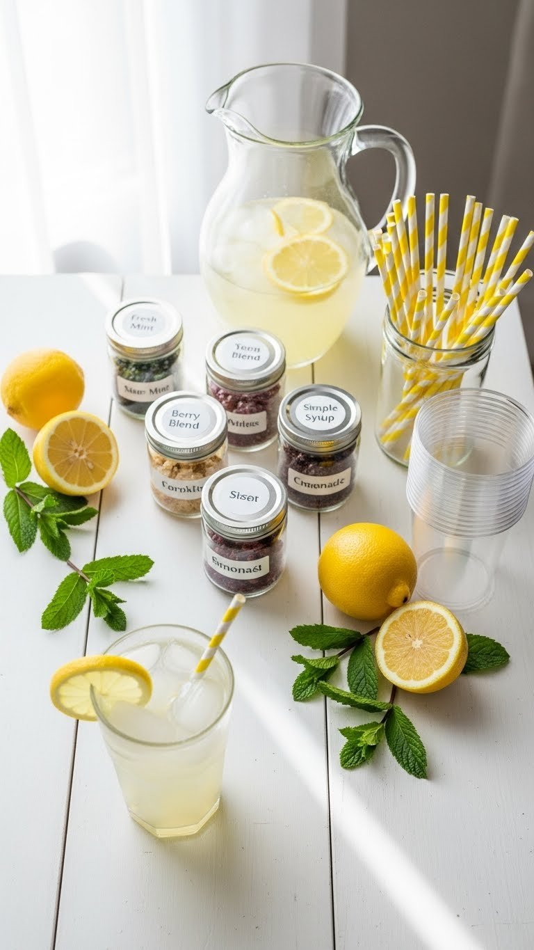 - Containers: 6–8 small glass jars or bowls and 1 large pitcher for lemonade.