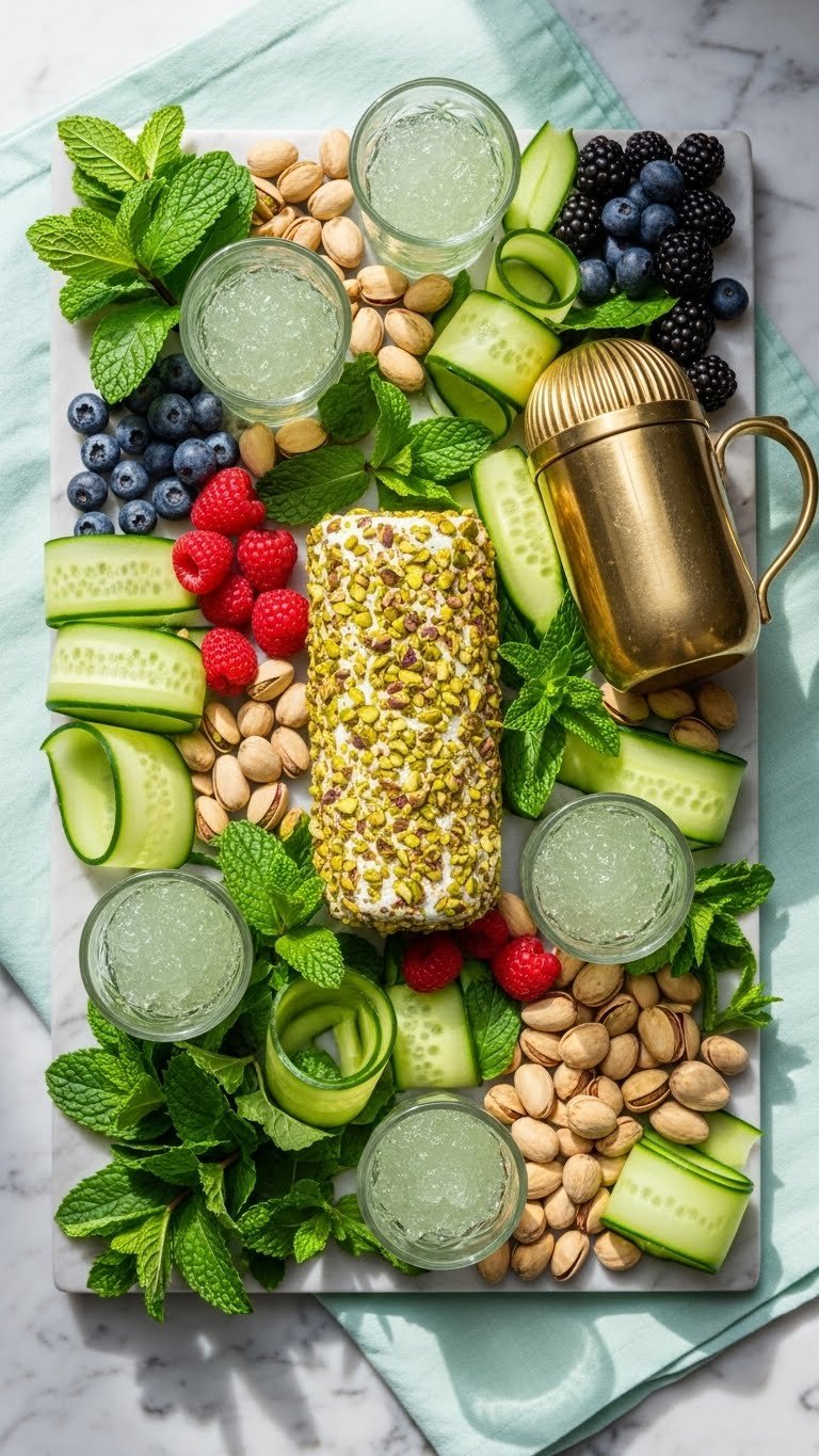 This Mint Julep Pairing Board celebrates mint and bright citrus. The star is a pistachio-crusted goat cheese log with a cooling cucumber element. Bourbon cherries and a mint-honey drizzle echo julep flavors.