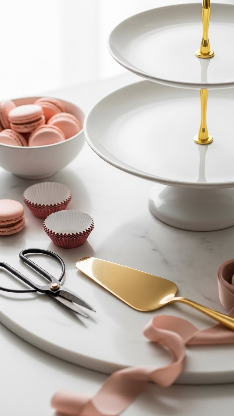 - Tiered stand (3-tier metal or ceramic, 10–12", 7–9", 4–6")