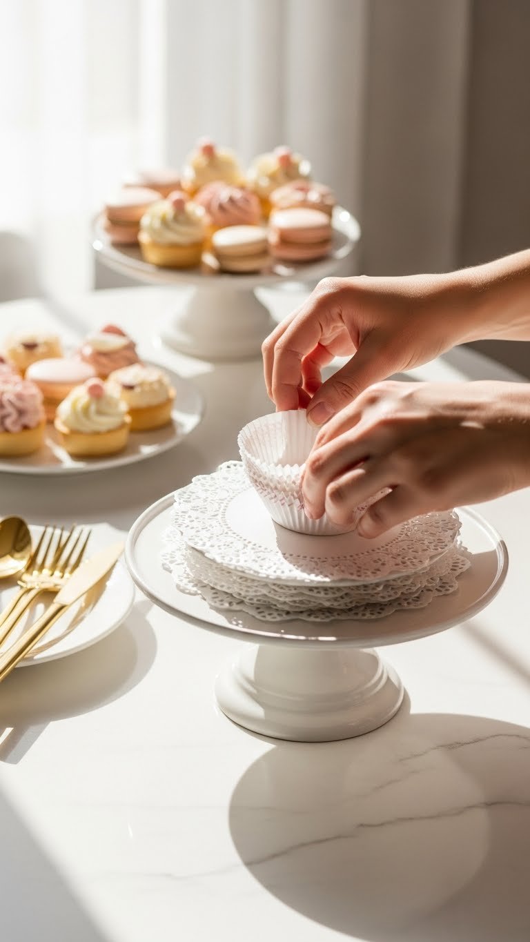 - Layer with doilies or liners: top tier—small items, middle—medium, bottom—largest.