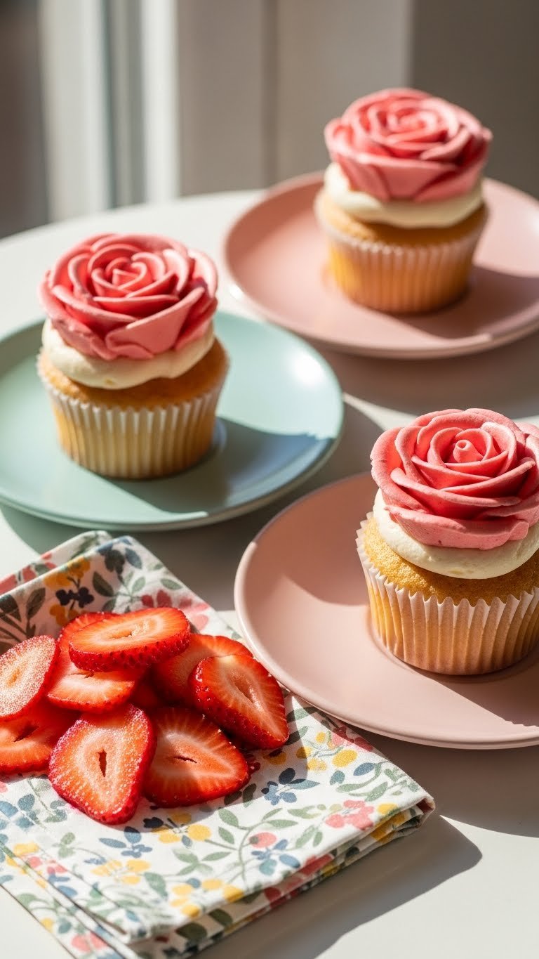 Serve on a glass cake stand with fresh strawberry halves. Add tiny mint leaves for contrast. Pair with sparkling rosé or lemonade. Store covered in the fridge up to 3 days. Make cupcakes a day ahead and top with buttercream on serving day.