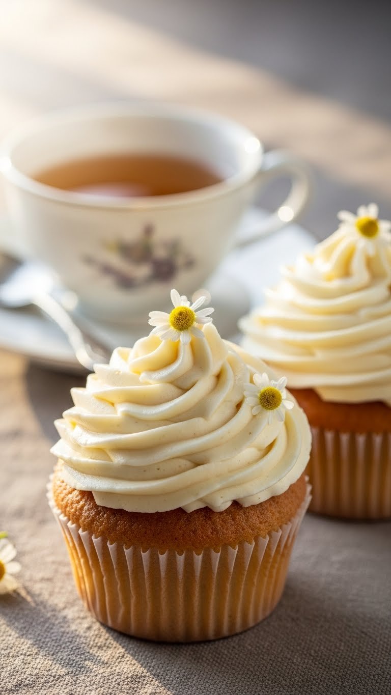 Chamomile vanilla cupcakes taste like a warm tea hug. The cake is tender with a mild floral tea note. The buttercream uses chamomile infusion for a delicate aroma. These are calming treats for a mellow baby shower afternoon.