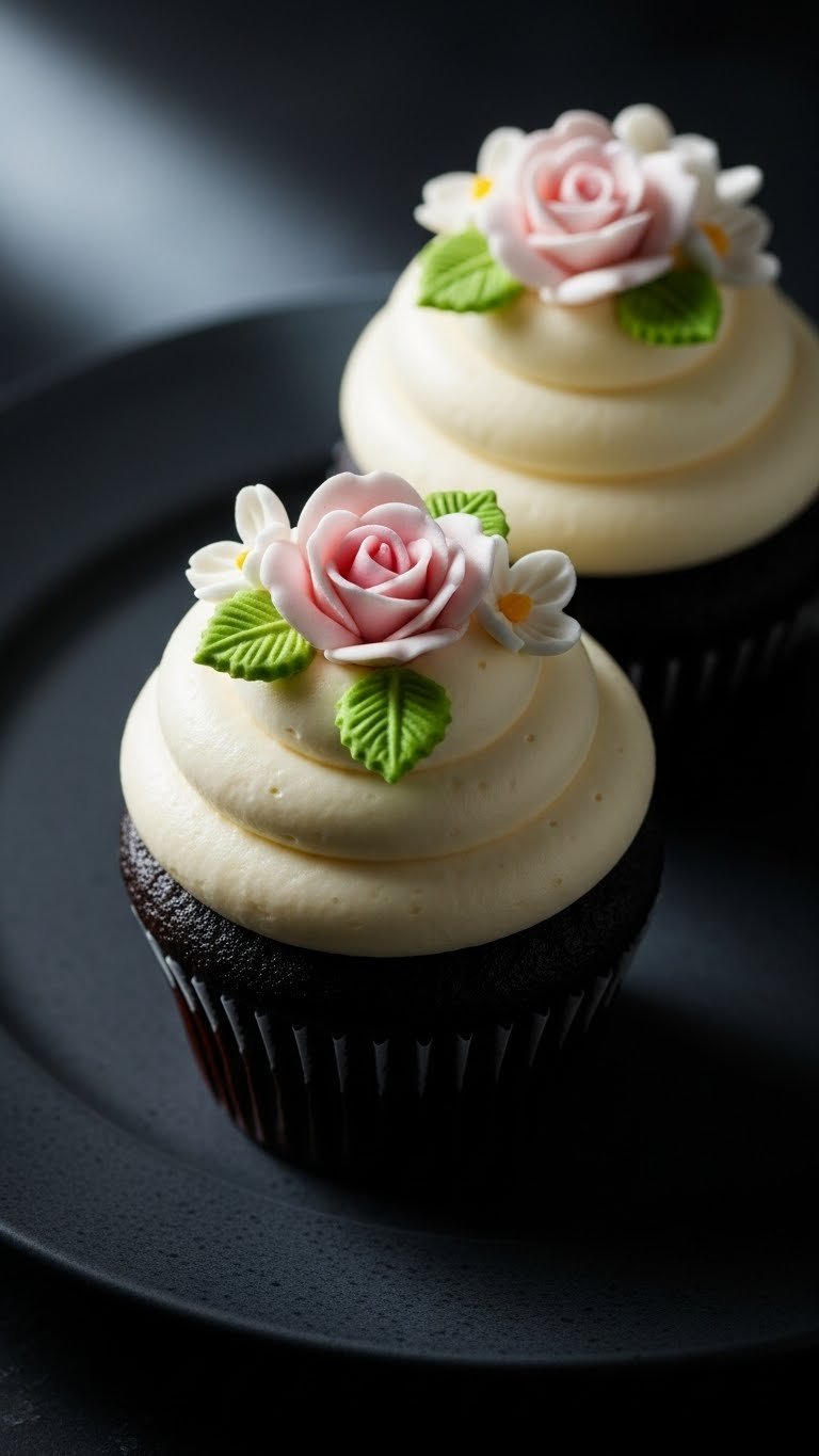 Black velvet cupcakes offer dramatic contrast for floral decoration. The cake is rich and cocoa-forward but visually dark and sophisticated. Ivory buttercream and sugar flowers make them pop. They’re great for a bold, modern baby shower.