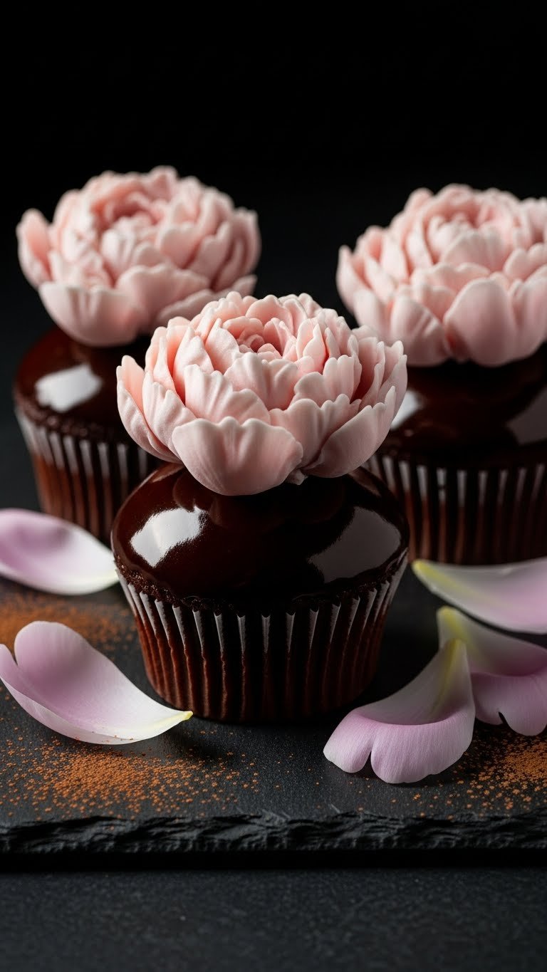 Rich dark chocolate peony cupcakes combine deep cocoa with floral sweetness. The cake is fudgy and moist. A white chocolate-peony topper adds contrast and elegance.