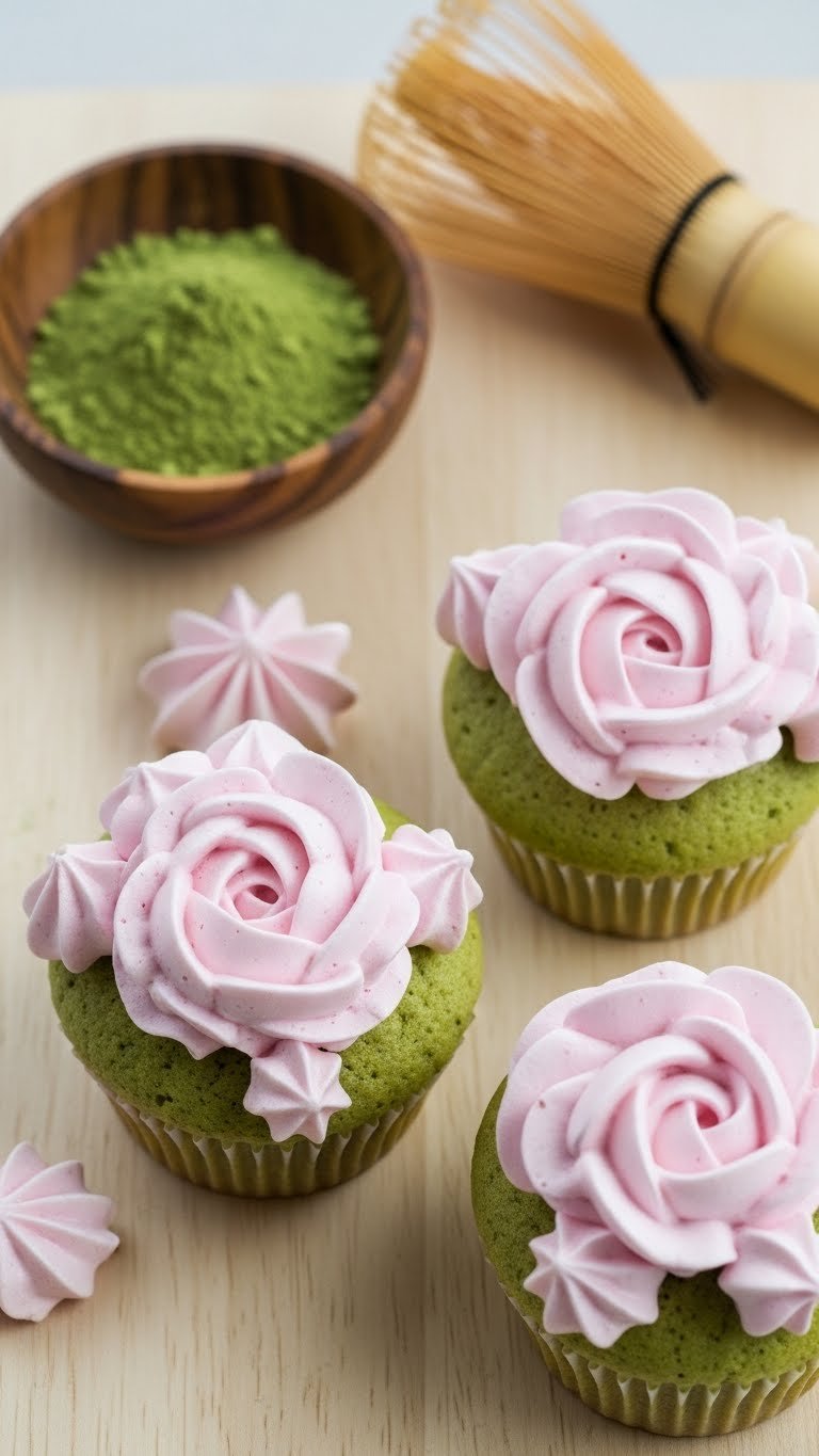 Matcha and cherry blossom cupcakes blend earthy green tea with subtle cherry floral notes. Matcha powder gives a gentle bitterness that balances sweet meringue flowers.