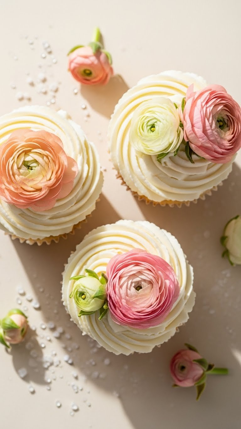 White chocolate and ranunculus cupcakes feel elegant and soft. The cake is bright and tender, with white chocolate folded into frosting for a rich, creamy finish. Sugar-dusted petal accents add sparkle.