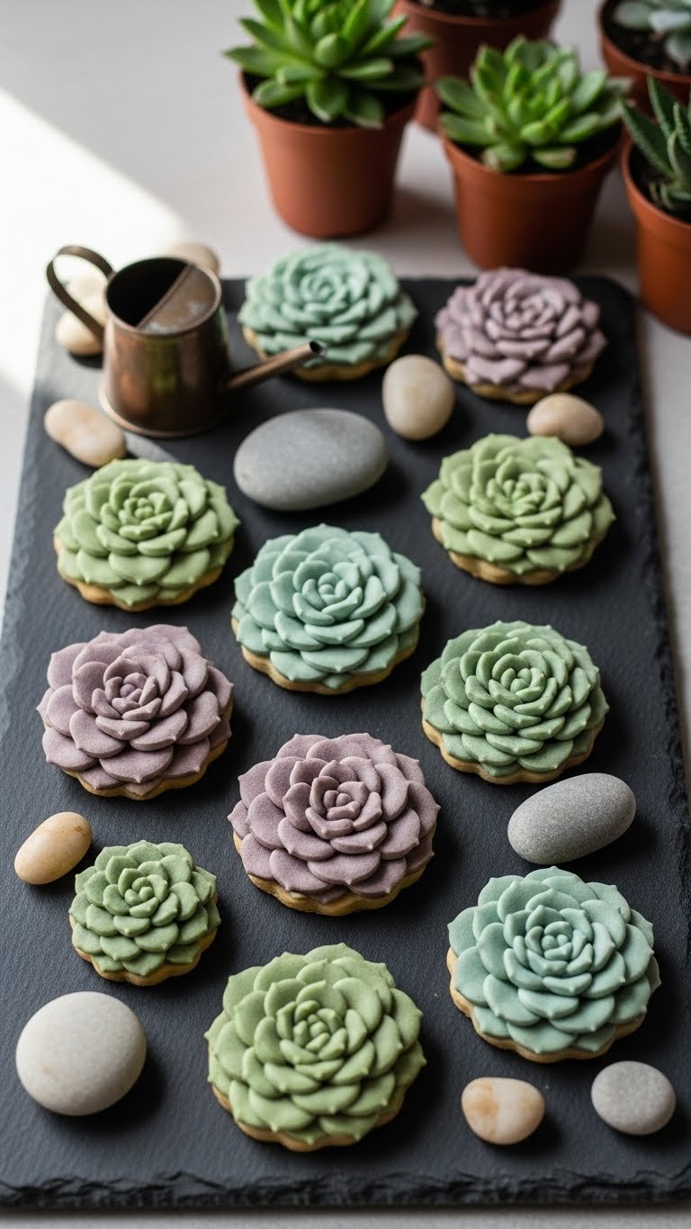 Arrange succulents in a shallow tray filled with sugar “sand” for a garden effect. Pair with herbal iced tea or a cactus-themed mocktail. Store in a cool, dry place in a single layer for 3–4 days. Make cookie bases ahead and pipe succulents the day before serving.