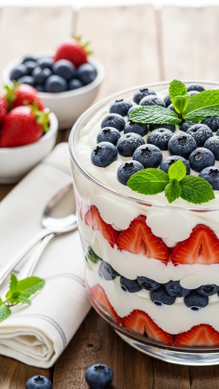 Serve in a large glass trifle bowl for a dramatic, patriotic centerpiece. Garnish with extra mint and whole berries for shine. Pair with light coffee or iced tea to balance the sweet cream. Store covered in the fridge for up to 2 days. Make the pudding and whipped cream a few hours ahead, then assemble just before guests arrive for best texture.