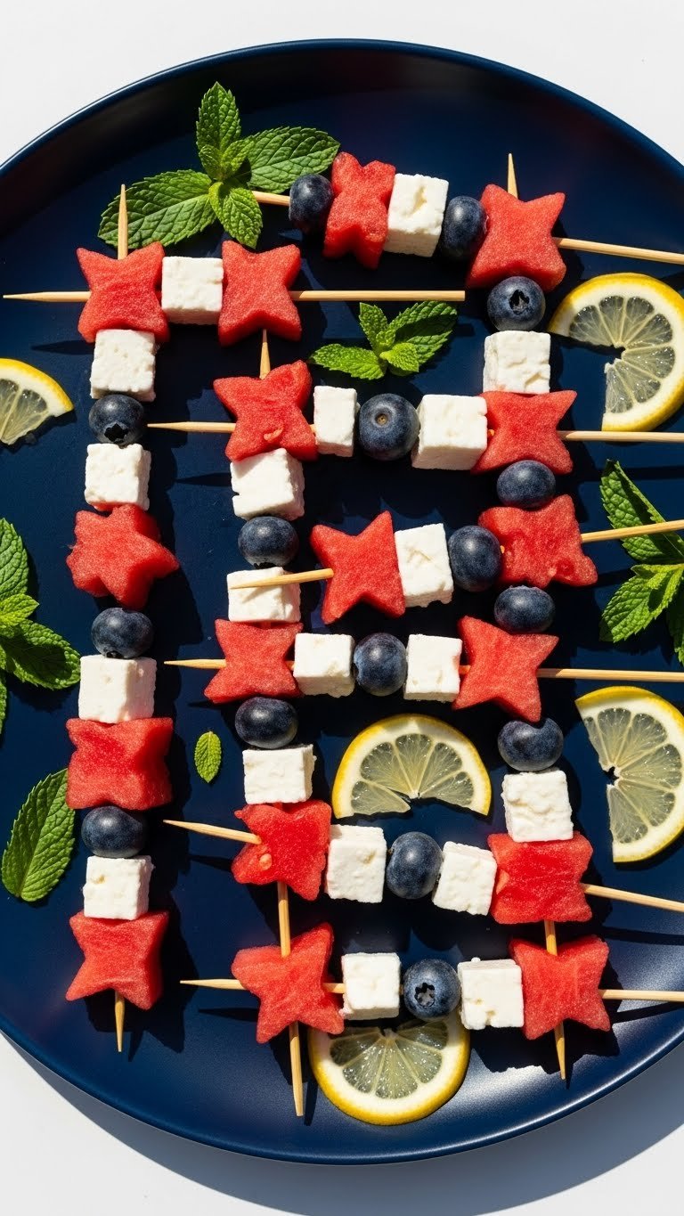 These star-shaped watermelon skewers are playful and refreshing. Sweet watermelon, salty feta, and tart blueberries create a lively contrast. They look festive and taste crisp and juicy. They fit the patriotic theme perfectly, and kids and adults both enjoy them. Expect bright citrus notes and cool texture in every bite.