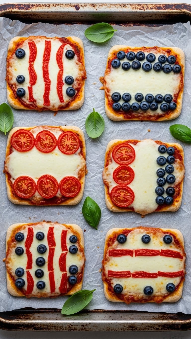 Arrange mini pizzas on a long platter to mimic a flag layout. Add extra basil for aroma. Pair with a crisp salad and chilled lemonade. Store leftover pizzas in the fridge for 2 days and reheat in a 375°F oven until warm. Assemble topping ahead and bake just before serving for fresh crust.