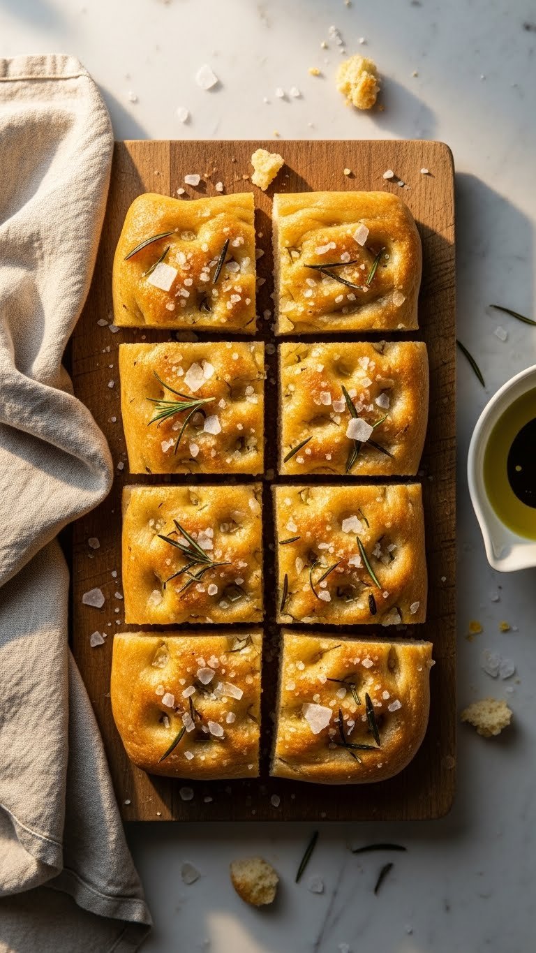 Serve warm or room temperature on a board. Lightly brush with more olive oil before serving. Cut into sandwich-ready squares or tear with fingers. Pair with charcuterie, marinated olives, or chilled white wine. Store in an airtight container for 2 days or freeze for longer. Make up to a day ahead, reheat briefly before packing.