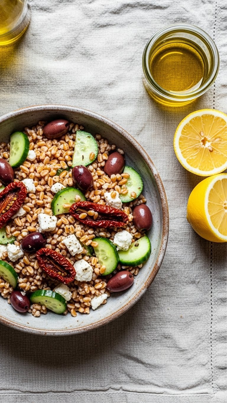 This farro salad is hearty and chewy with Mediterranean brightness. Farro holds up well and keeps textures distinct. Marinated olives and feta add savory depth. The salad is meal-worthy and great for sharing. Prep: 10 minutes | Cook: 25–30 minutes.
