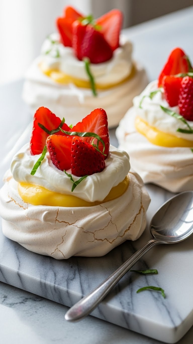 14. Strawberry Basil Pavlova Cups with Lemon Curd