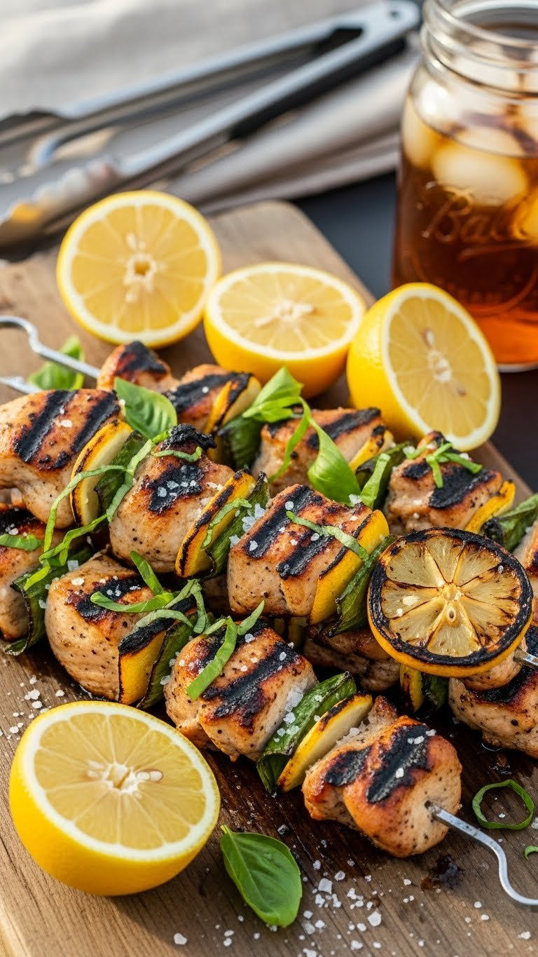 Serve on a long wooden board with lemon wedges and extra basil sprigs. Offer a light yogurt-garlic dipping sauce. Pair with chilled white wine, iced tea, or lemonade. Store leftovers in an airtight container for 3 days in the fridge. You can marinate the chicken the night before and skewer just before grilling.