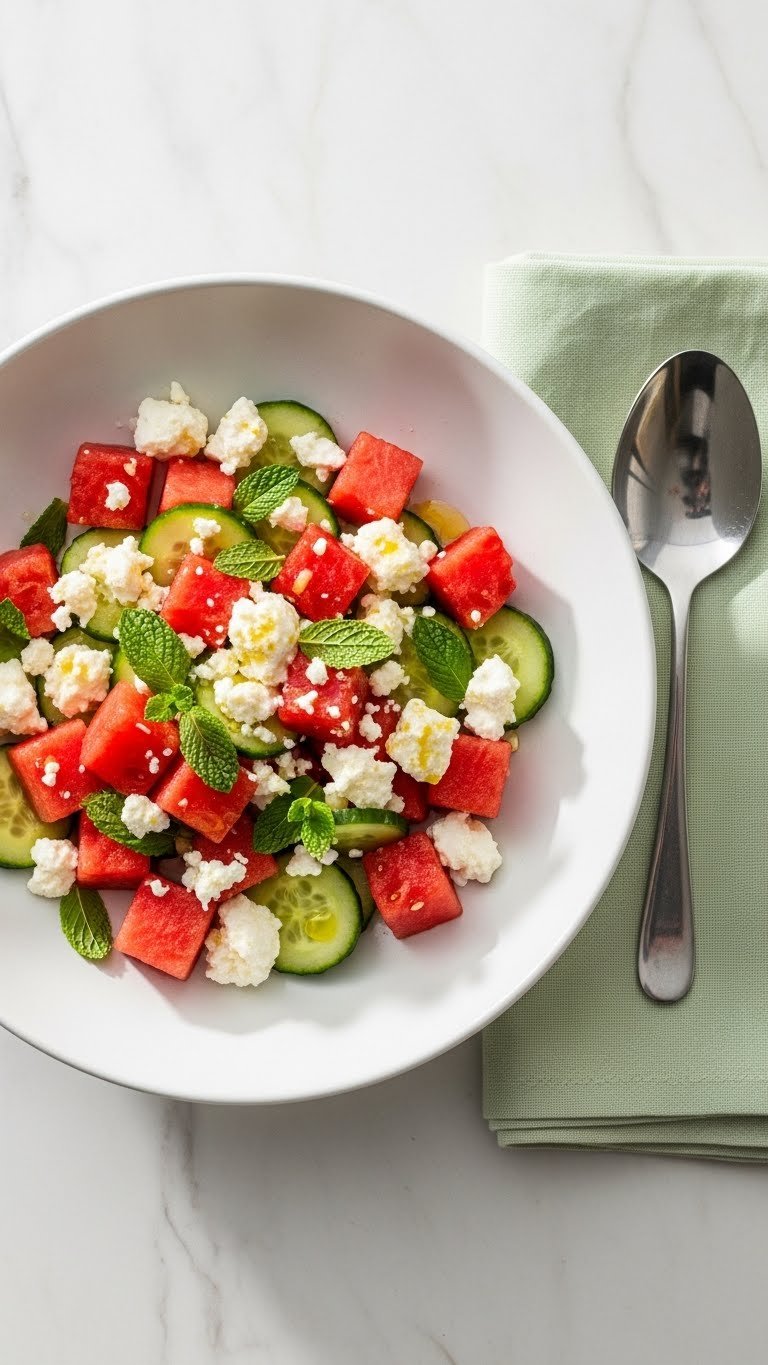 - Combine watermelon, cucumber, feta, mint, and red onion in a large bowl.