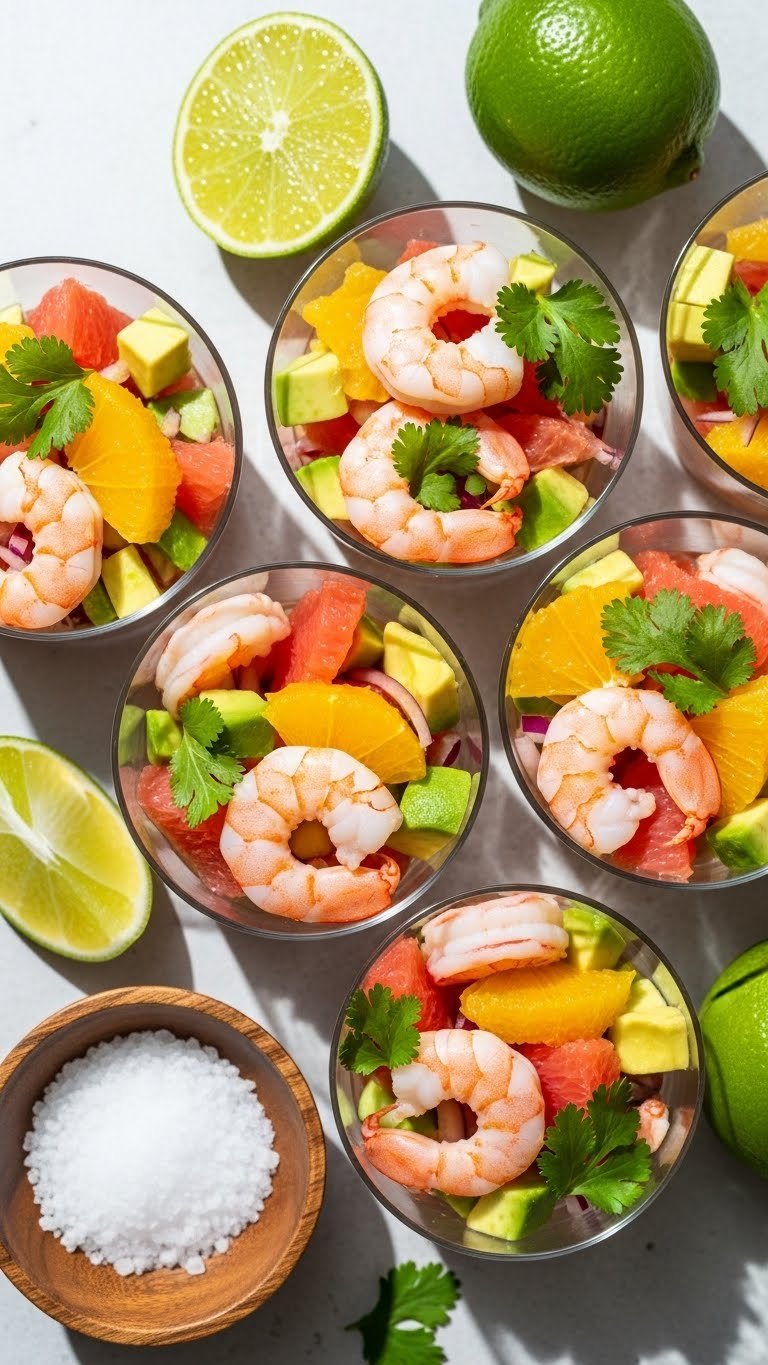 Serve in small clear cups so layers show. Add a lime wedge and a small tortilla chip for scooping. Pair with crisp white wine or a citrus mocktail. Prepare shrimp and veggies up to 4 hours ahead and add avocado before serving. Keep chilled on a tray of ice for outdoor events.