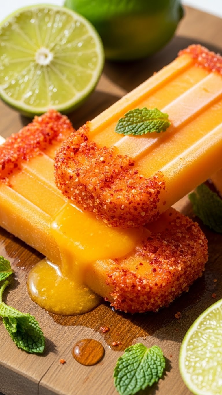Refreshing mango popsicles with a tangy lime kick and spicy-sweet rim. They’re fruity, bright, and perfect for hot outdoor celebrations. They fit a graduation party because they’re handheld and crowd-pleasing. Fruit-lovers and kids will race for them. The first taste is cool mango, then a mild chili-sugar tingle.