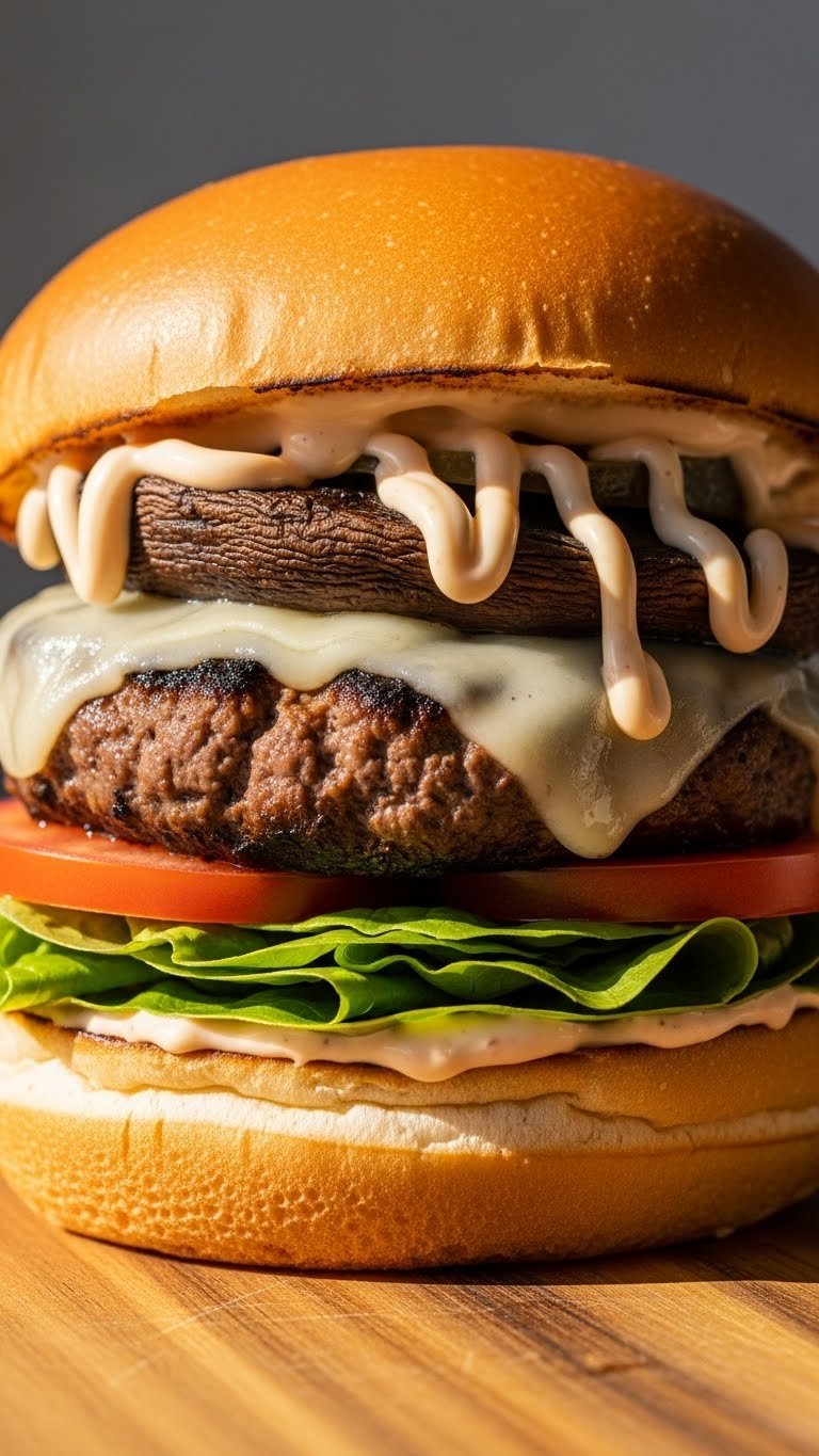 - Assemble burgers on toasted buns with lettuce, tomato, mushroom, and a generous smear of mayo.