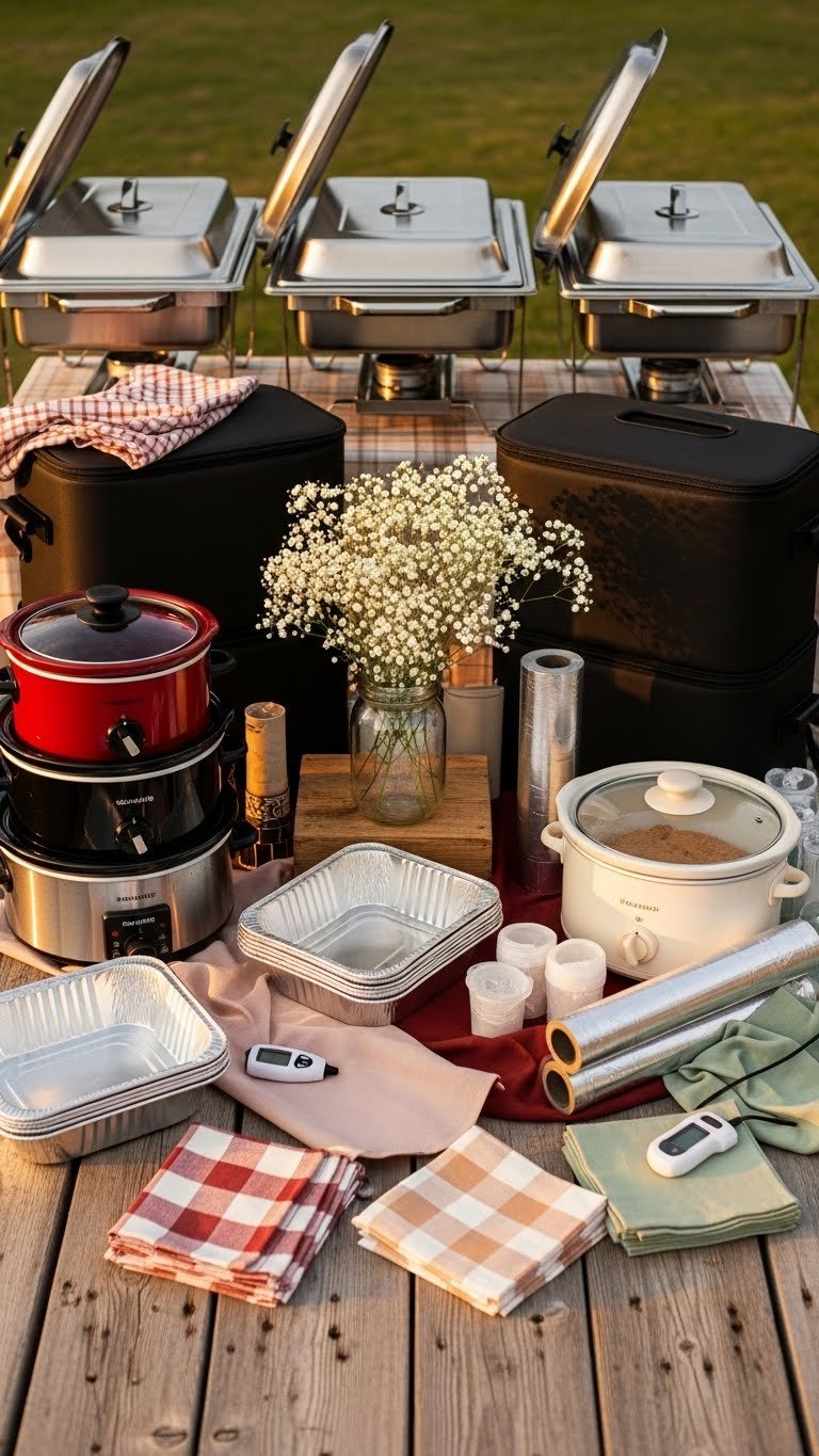 - Essentials: chafing dish(s), canned sterno or electric warmers, insulated carriers, crockpots, heavy-duty aluminum pans, foil, towels.