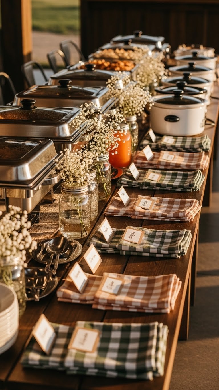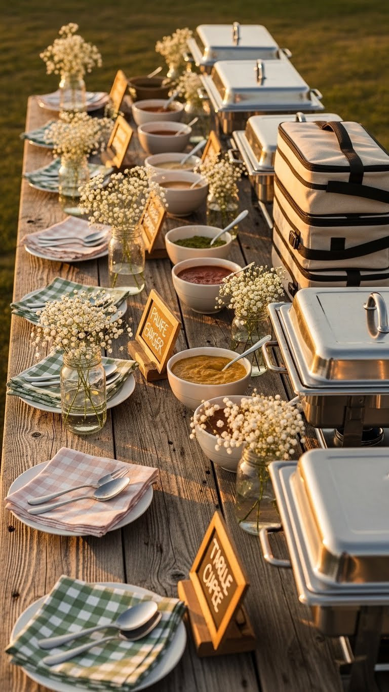 Create zones: a main hot zone for proteins and a warm-holding zone for sides and breads. Preheat chafers and crockpots 30–45 minutes before food arrives.