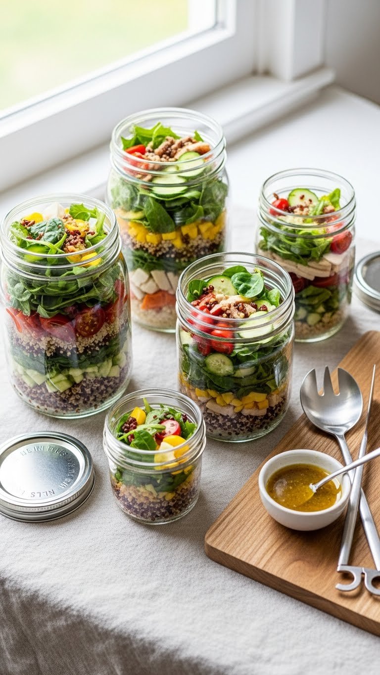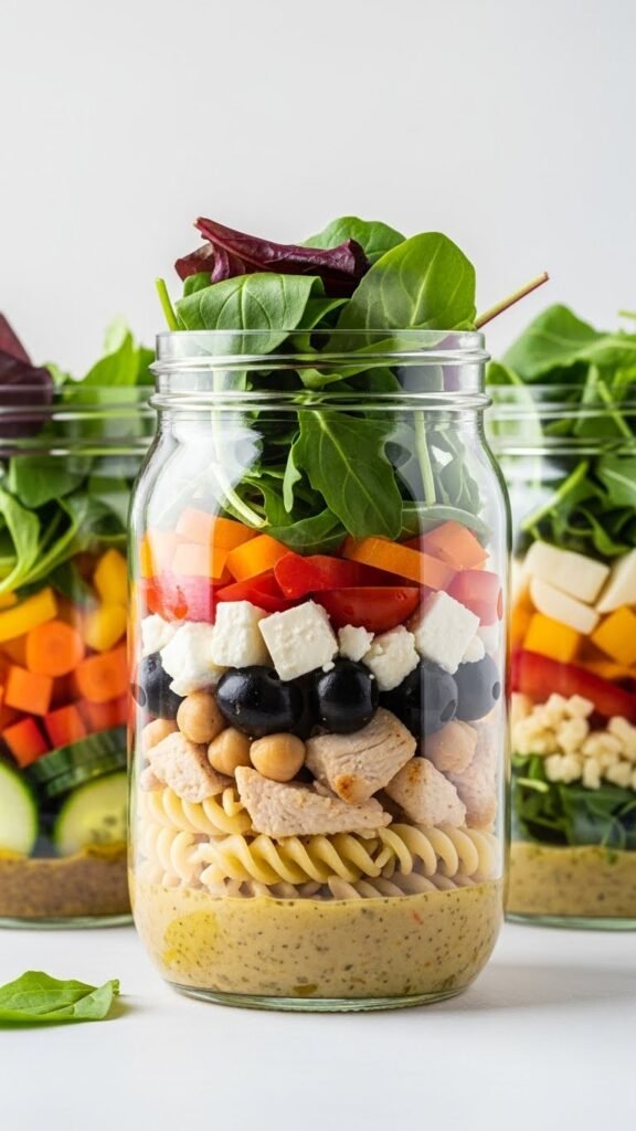 - Dressing first — Add 2 tbsp of dressing to the jar bottom. This keeps pasta from getting soggy.