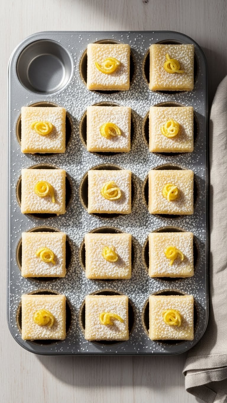 Arrange mini bars on tiered trays with small forks or toothpicks. Garnish with micro-mint or tiny candied lemon curl. Pair with champagne or iced tea. Store in fridge up to 3 days. Make the crust a day ahead and assemble the next day.