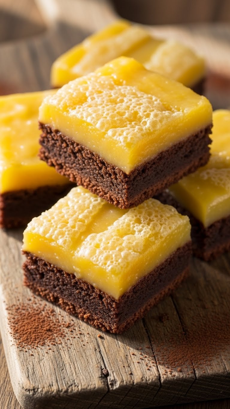 - Check doneness: brownie layer should be moist but baked, lemon layer set.