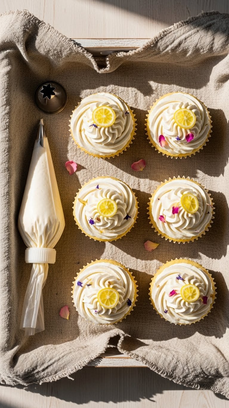 Display cupcakes on a white cake stand with fresh lemon slices and small flower clusters. Pair with herbal tea or a light champagne. Make cupcakes the morning of the event for best texture. You can freeze unfrosted cupcakes up to 1 month; thaw fully before frosting. For a bridal shower, color buttercream pale yellow or cream for a delicate palette.