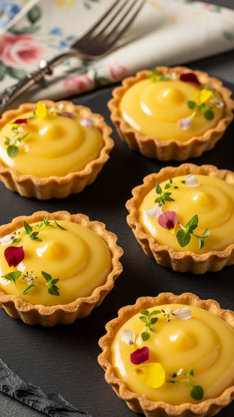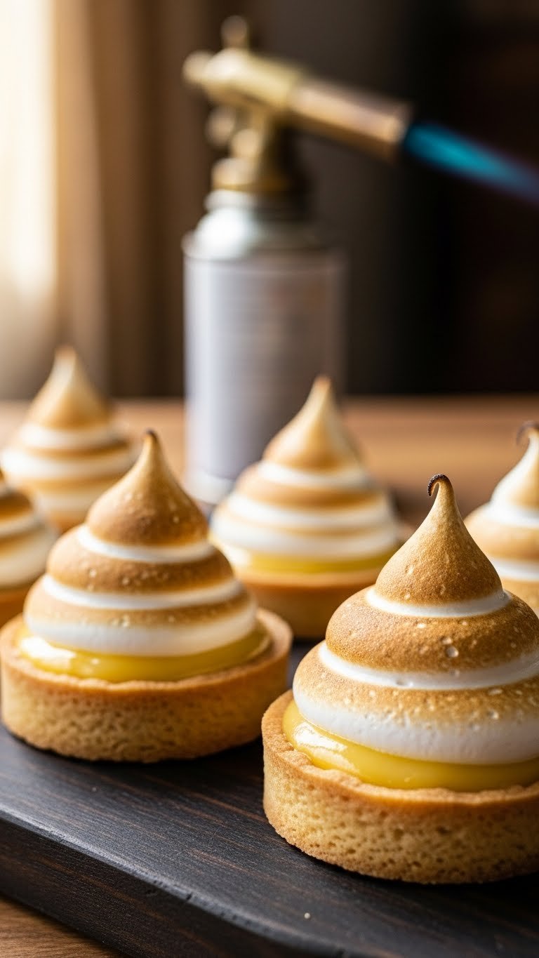 Present tartlets on a dark platter for contrast with golden meringue. Garnish with small candied lemon rounds or micro-mint. Pair with sparkling wine or chamomile tea. Make curd a day ahead and assemble the day of for best texture. Toast meringue just before serving for the best visual pop.