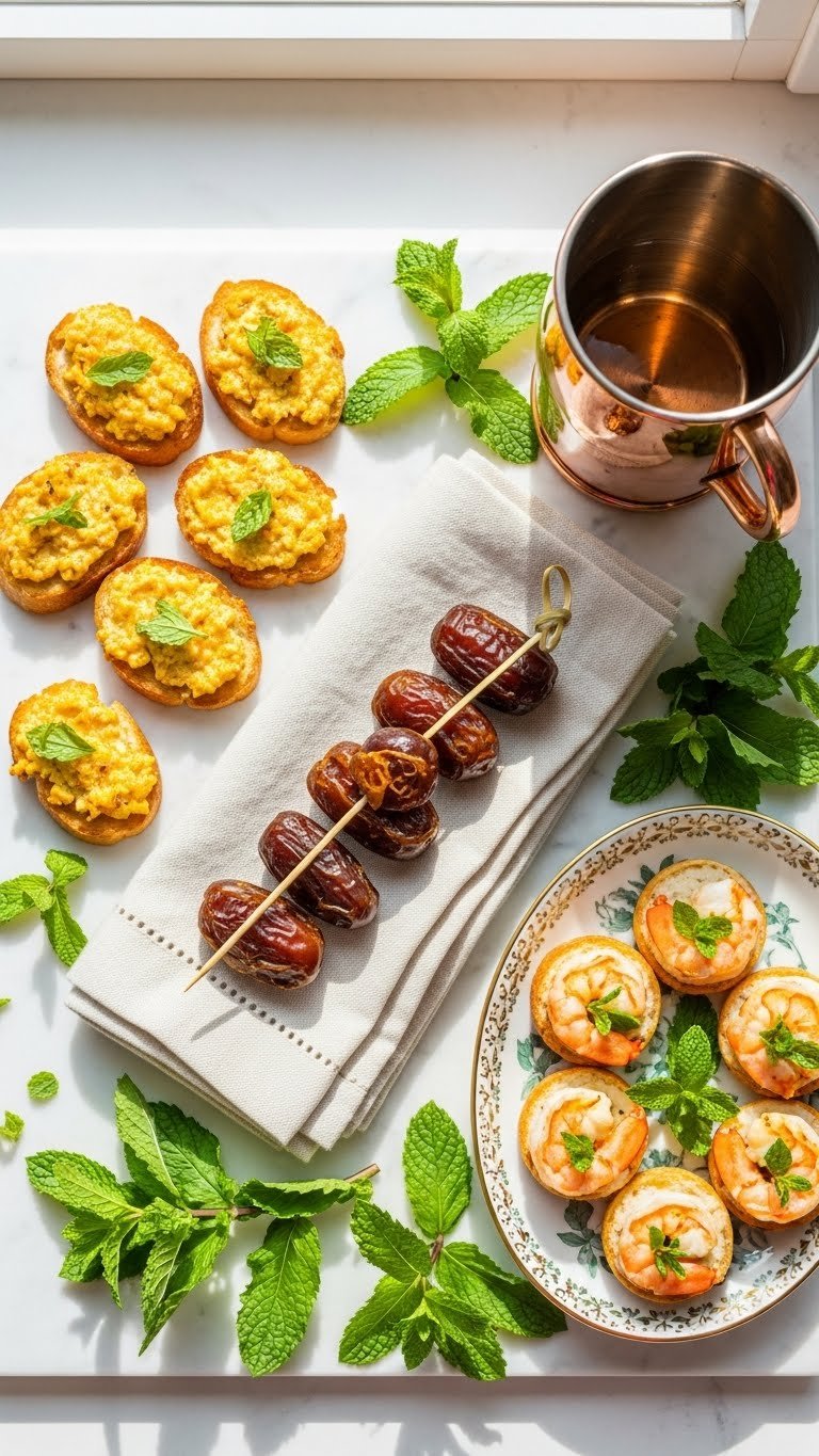 Gather these staples for three recipes: pimento crostini, bourbon-glazed bacon-wrapped dates, and minty shrimp cups.
