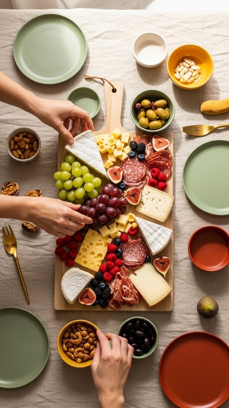 - Arrange: Build a grazing board quickly — place cheeses first, fill gaps with fruit, meats, and crackers. Add herbs for color.