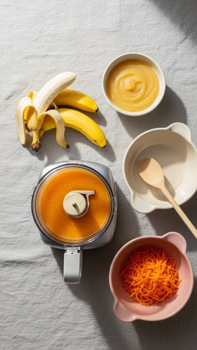 - Mash or blend fruits: In a food processor, blitz bananas and apple puree until smooth for even texture.