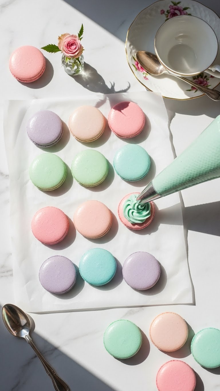 - Fill shells with buttercream, ganache, or jam using 10–12 g filling per macaron.