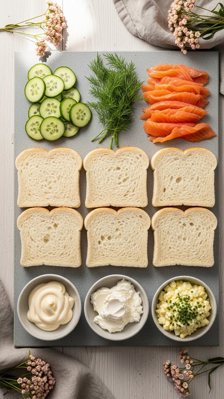 - Fillings: cucumber with ¼ tsp salt, egg salad (2 hard-boiled eggs + 1 tbsp mayo), smoked salmon with cream cheese (2 oz + 1 tbsp).