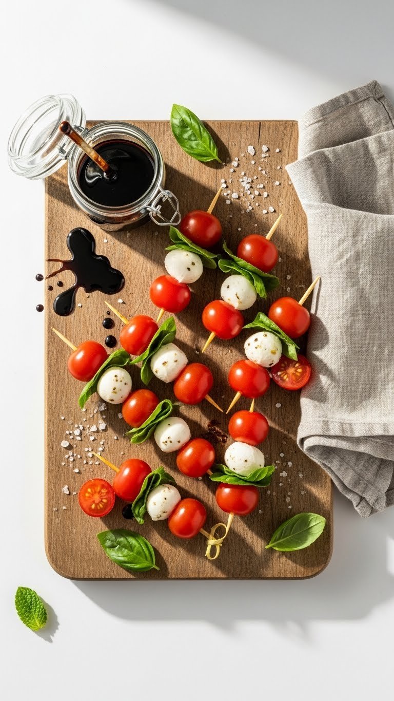 These mini Caprese skewers swap basil for mint for a bright twist. Juicy cherry tomatoes, creamy mozzarella, and cool mint pair well with a balsamic drizzle. They're bite-sized, fresh, and bright. Guests who love fresh herbs and light snacks will enjoy them. Expect a juicy burst, creamy texture, and sharp balsamic finish.