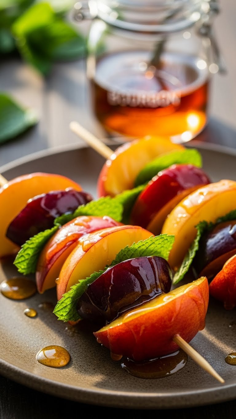 5. Mint Julep Party Snacks: Bourbon-Poached Stone Fruit Skewers with Honey-Lime Drizzle