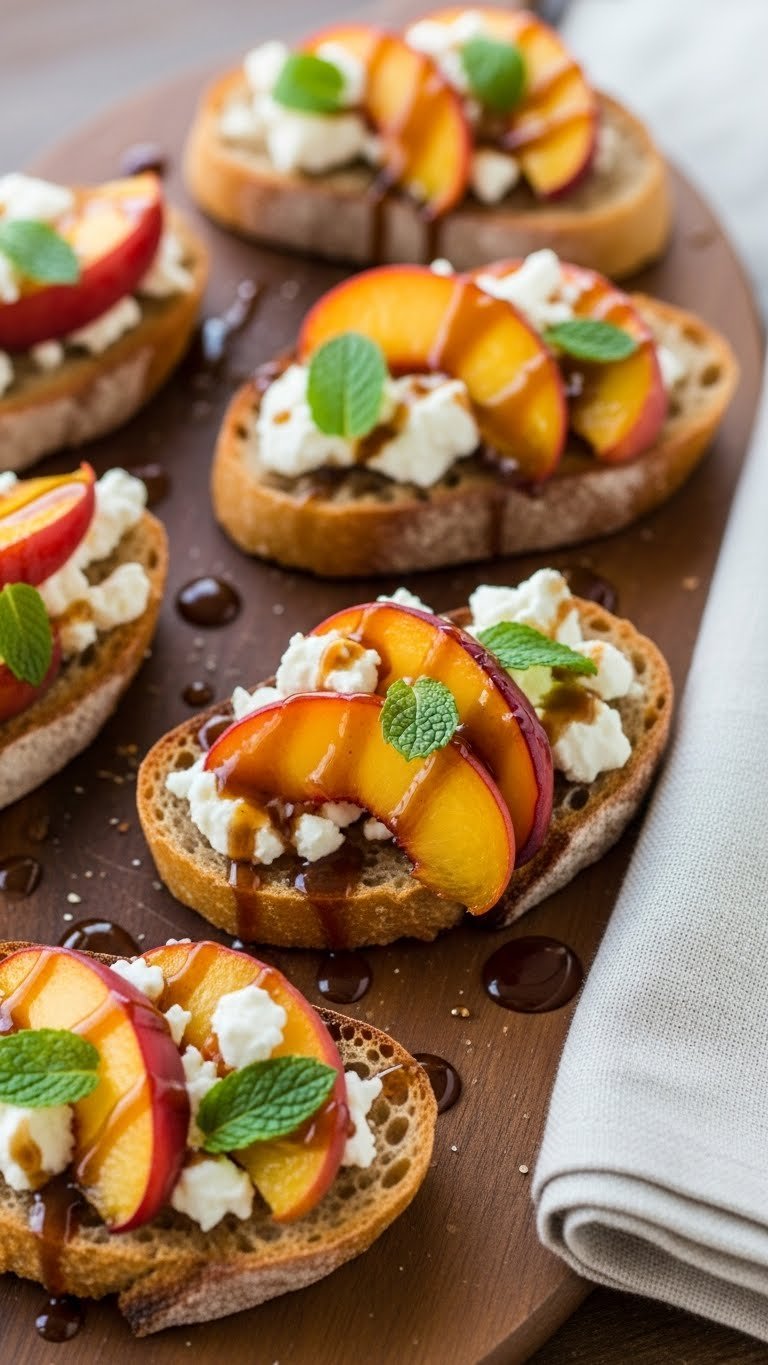 Place bruschetta on a rustic board and garnish with mint sprigs. Pair with a classic Mint Julep or an oaked white wine. Store components separately up to 2 days; rewarm peaches gently and assemble before serving. Great for summer and early fall gatherings.