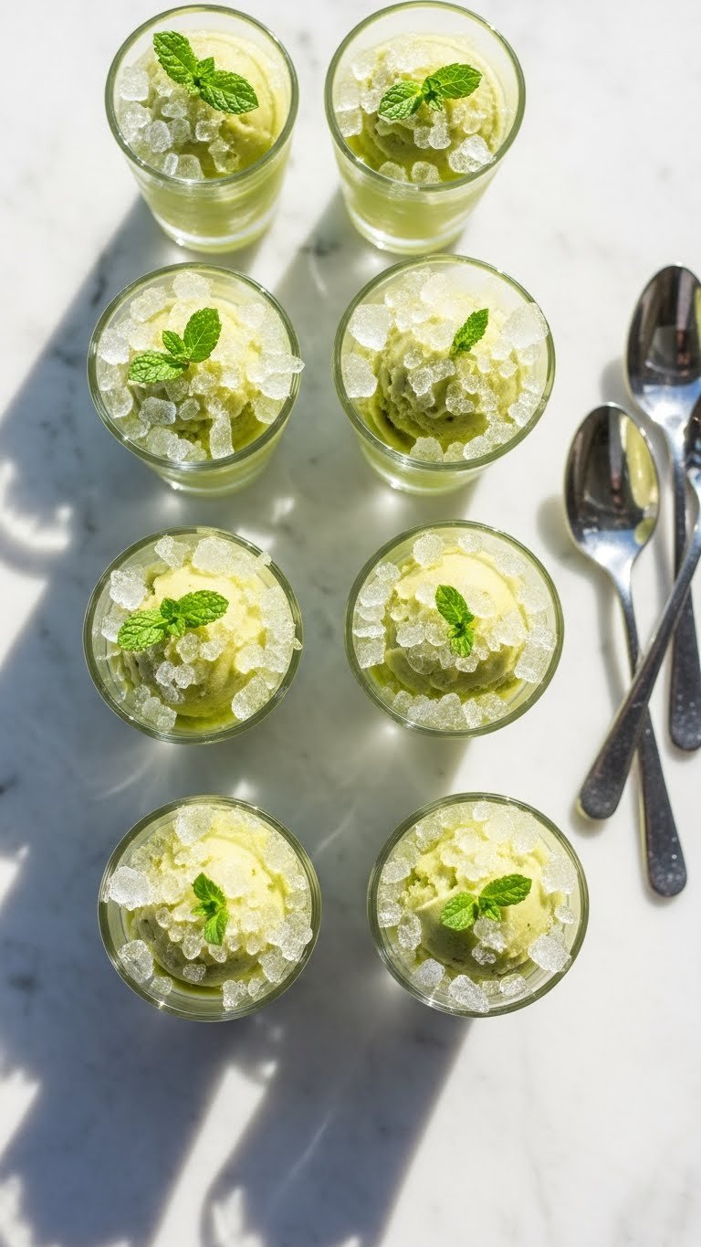 These mini sorbet shooters mimic a frozen Mint Julep in spoonable form. They’re icy, minty, and perfectly portioned. The sorbet cleanses the palate between savory bites. Guests who want a cool, refreshing finish will love them. Expect a bright mint scent and crisp, icy texture.