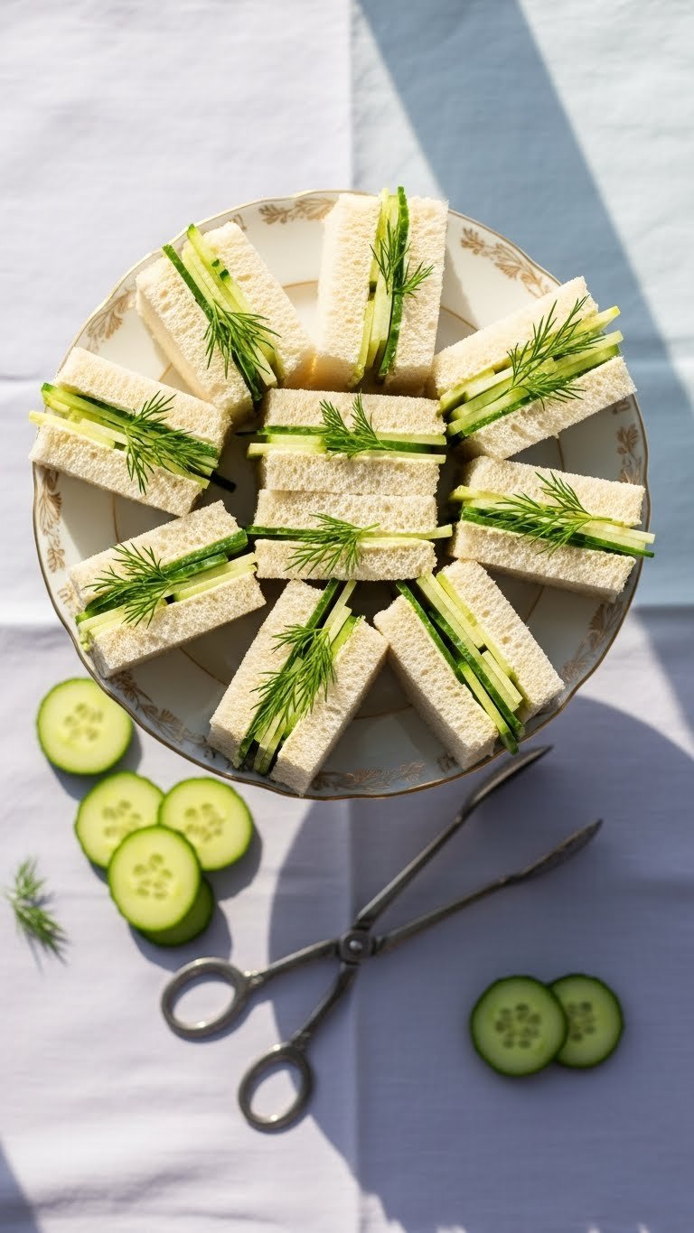 Stack sandwiches on a tiered serving tray with small napkins. Garnish the platter with lemon wedges and extra dill. Pair with iced green tea or a light prosecco. Make ahead up to 6 hours; assemble, wrap in plastic, and chill. Store up to 24 hours in the fridge to keep cucumbers crisp.