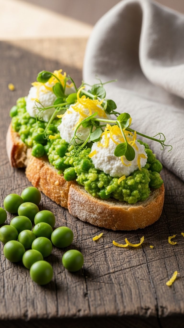 This herbed pea and ricotta crostini is fresh, bright, and creamy. Blended peas with lemon and mint make a vibrant spread. The ricotta adds a soft, silky counterpoint.