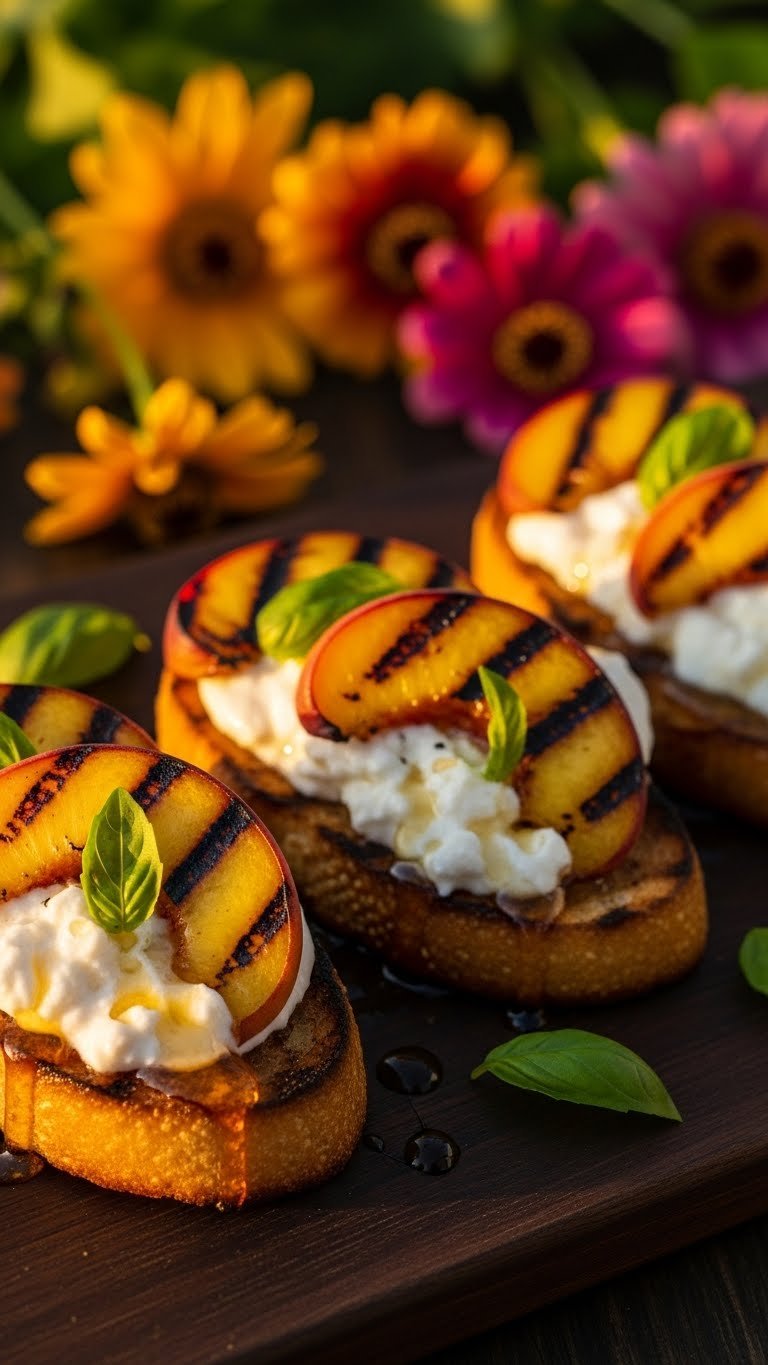 This grilled peach bruschetta pairs smoky-sweet peaches with creamy burrata and a fresh basil finish. The char brings caramel notes that complement the cheese. Texture is juicy peach and silky burrata on crunchy toast.