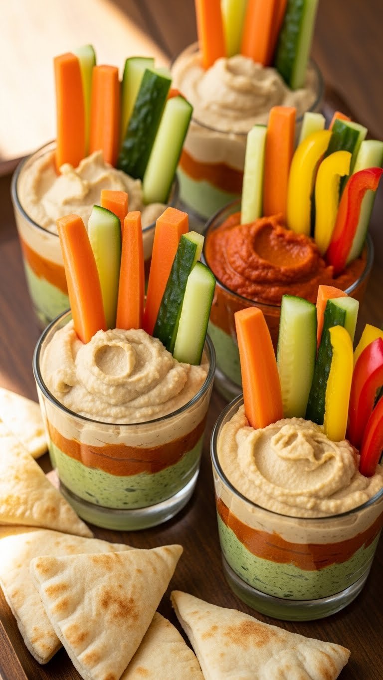 These rainbow veggie hummus cups are colorful, crunchy, and perfectly portioned. Each cup gets creamy hummus and a rainbow of veggie sticks standing upright. The contrast of creamy and crisp textures is a hit.
