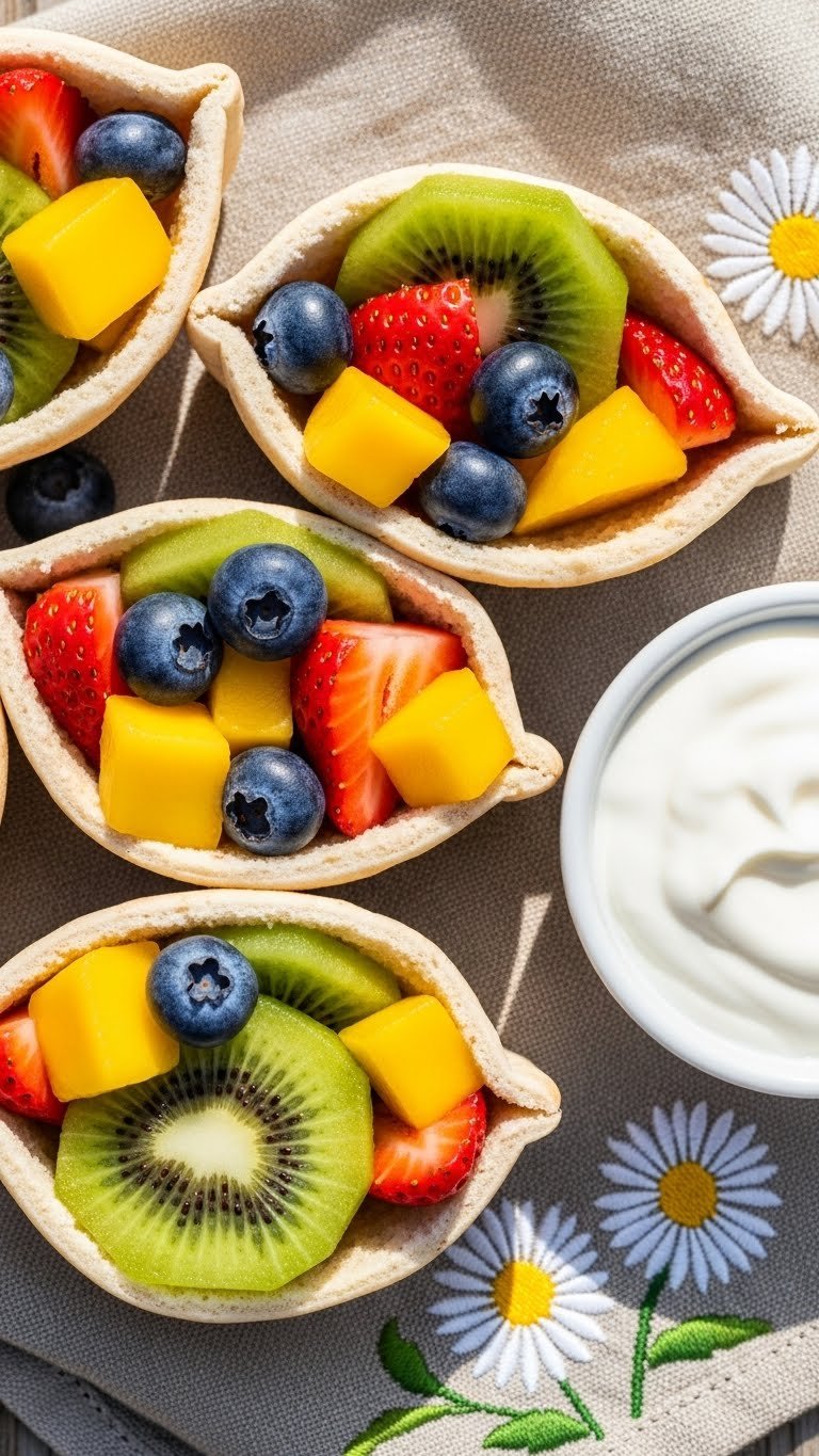 Mini fruit pitas are colorful, crunchy, and sweet without added sugar. Fill small pita rounds with mixed fruit for a handheld fruit pocket kids can easily eat. The honey yogurt dip adds creamy sweetness.
