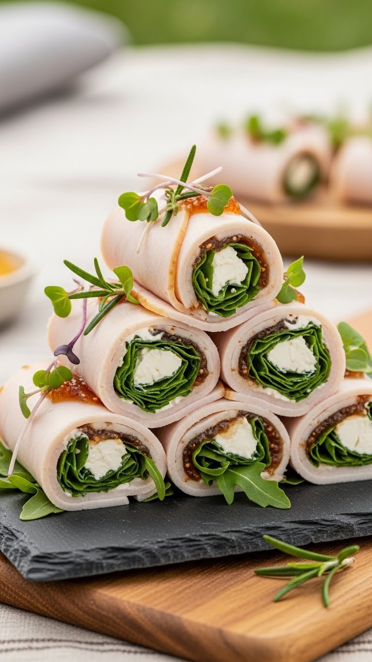 These roll-ups are tidy and elegant. Sweet fig jam meets tangy goat cheese and peppery arugula. Thin turkey slices hold everything in a neat bite. They’re perfect for a classy picnic or a quick office lunch. You’ll love the contrast of creamy, sweet, and peppery flavors. Expect soft, silky turkey, a hint of fig, and a fresh herb aroma.