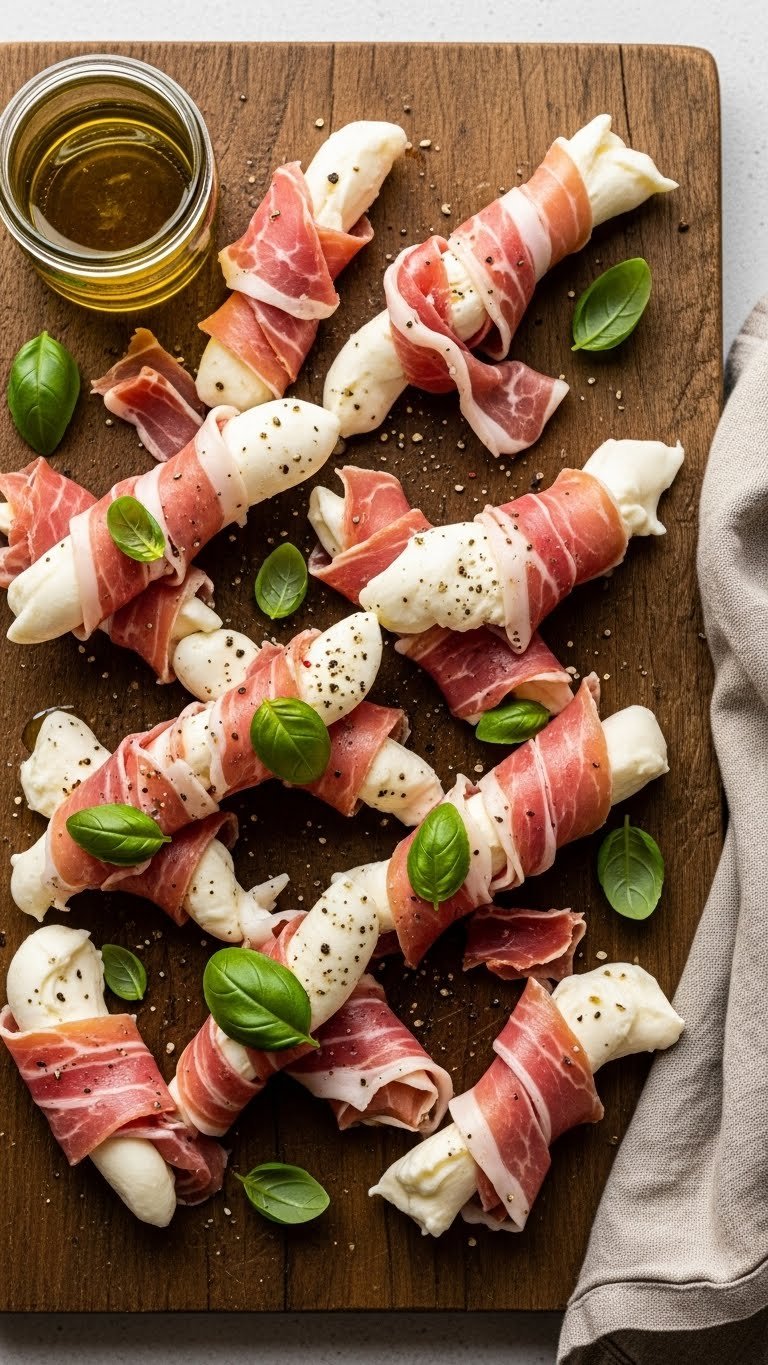 - Lay a prosciutto strip flat; place a basil leaf and a mozzarella stick at one end.