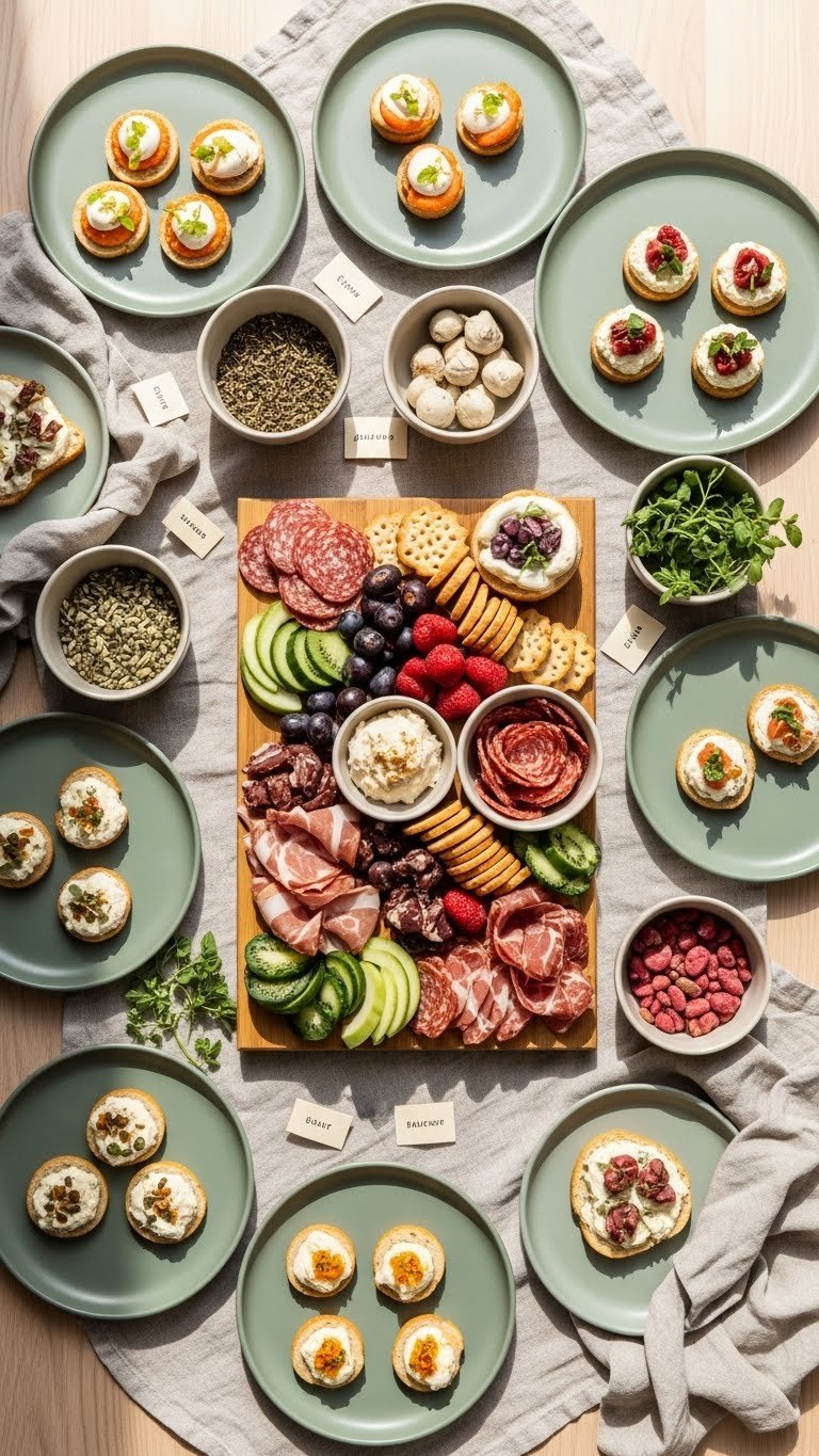- Include one warm item (mini quiches or crostini), two cold items (salads, chilled shrimp), and two sweet items (mini tarts, fruit skewers).