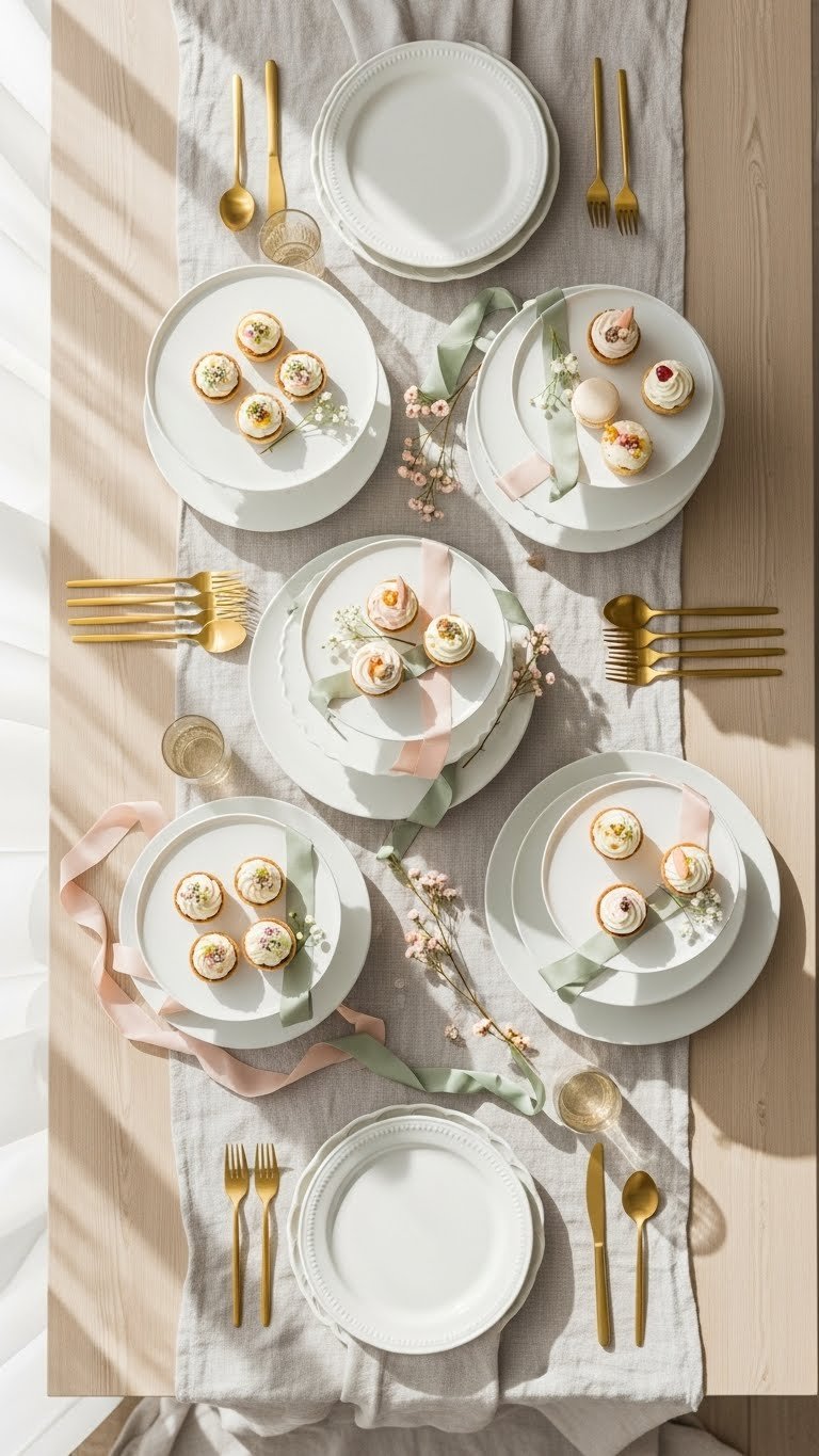- Anchor the center with a statement cake or tiered stand.