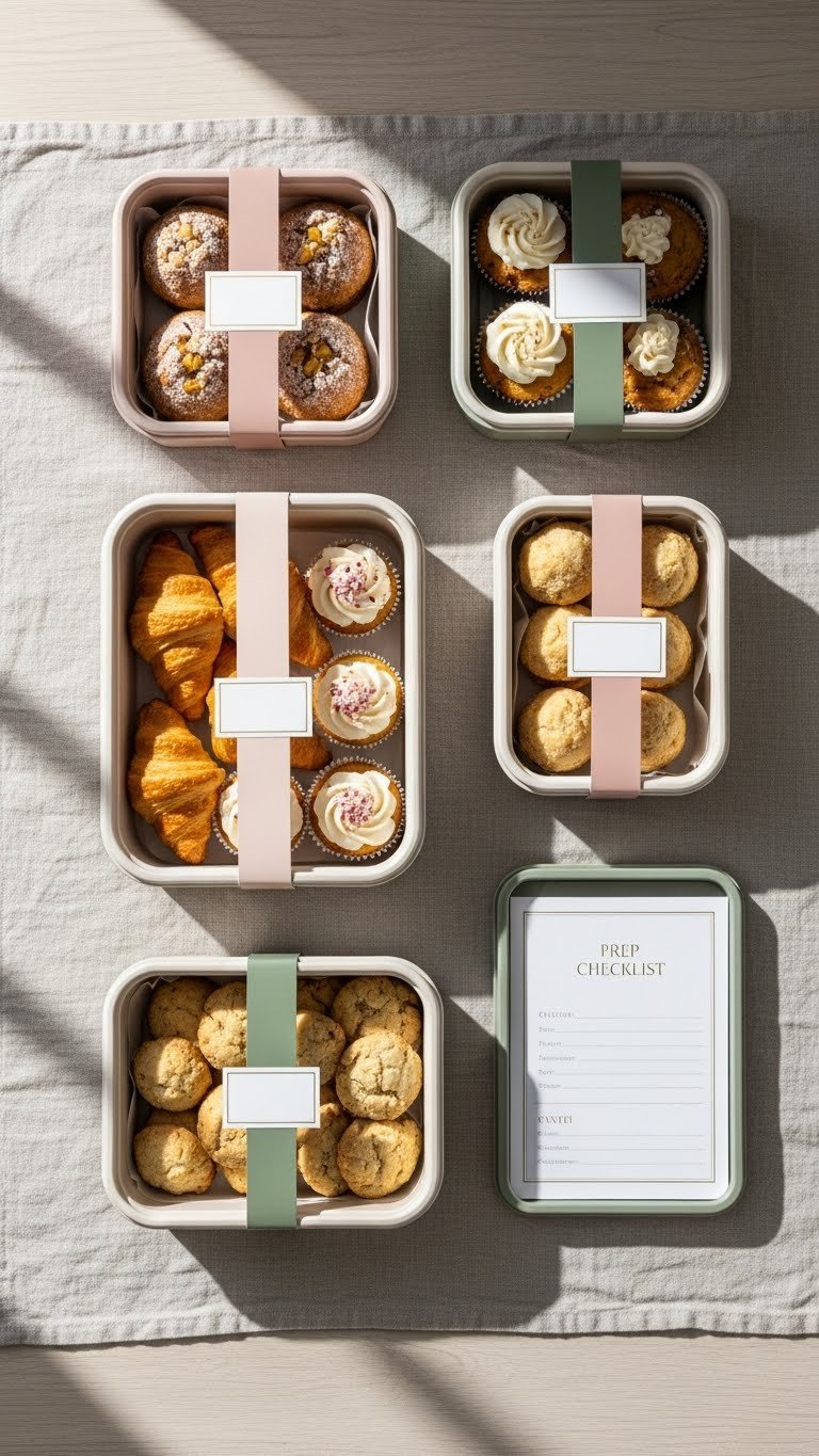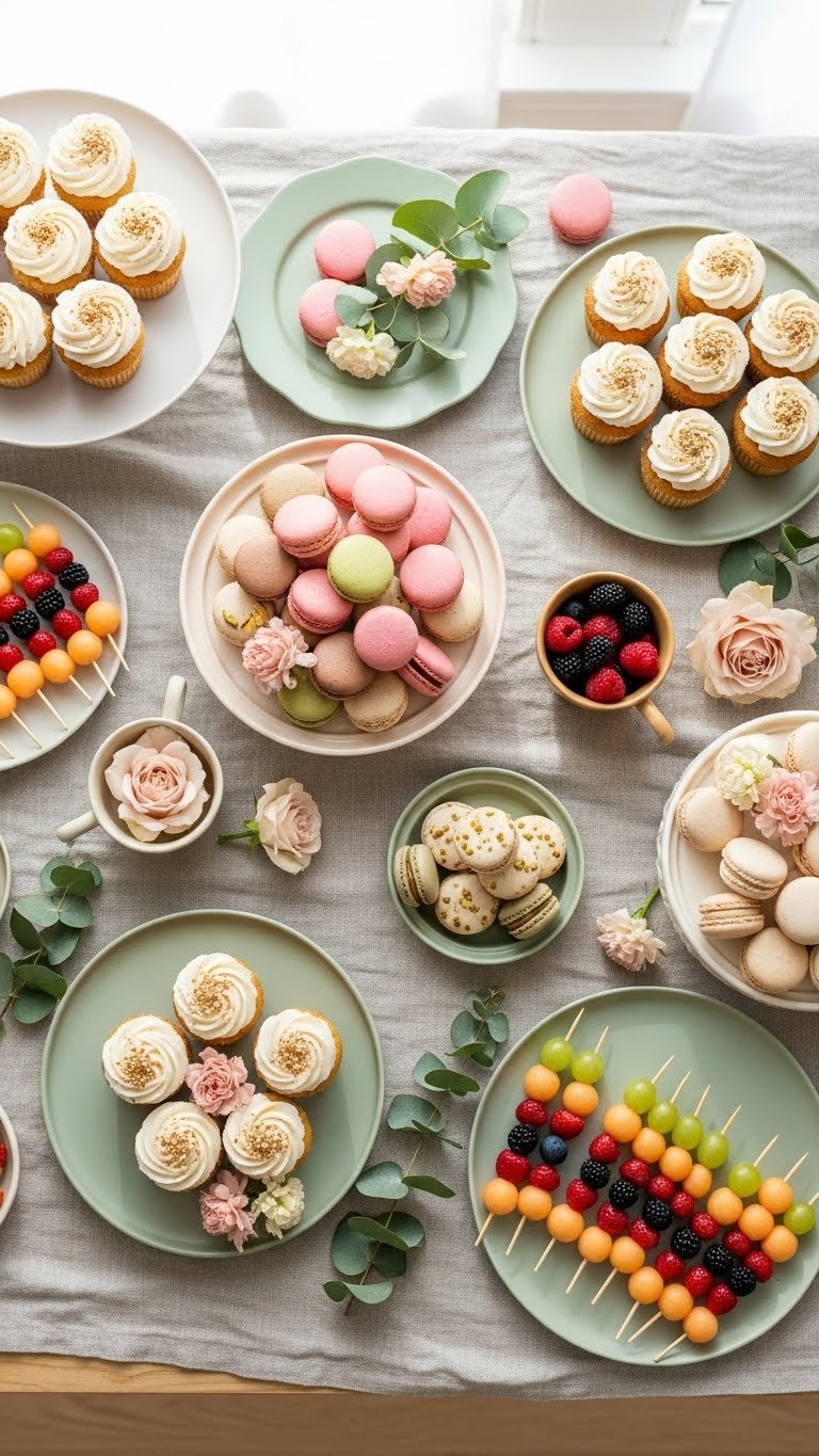 - Quantities: for 30 guests, plan 90–120 total bites (e.g., 24 cupcakes, 36 cookies, 24 mini tarts, 12 brownies).