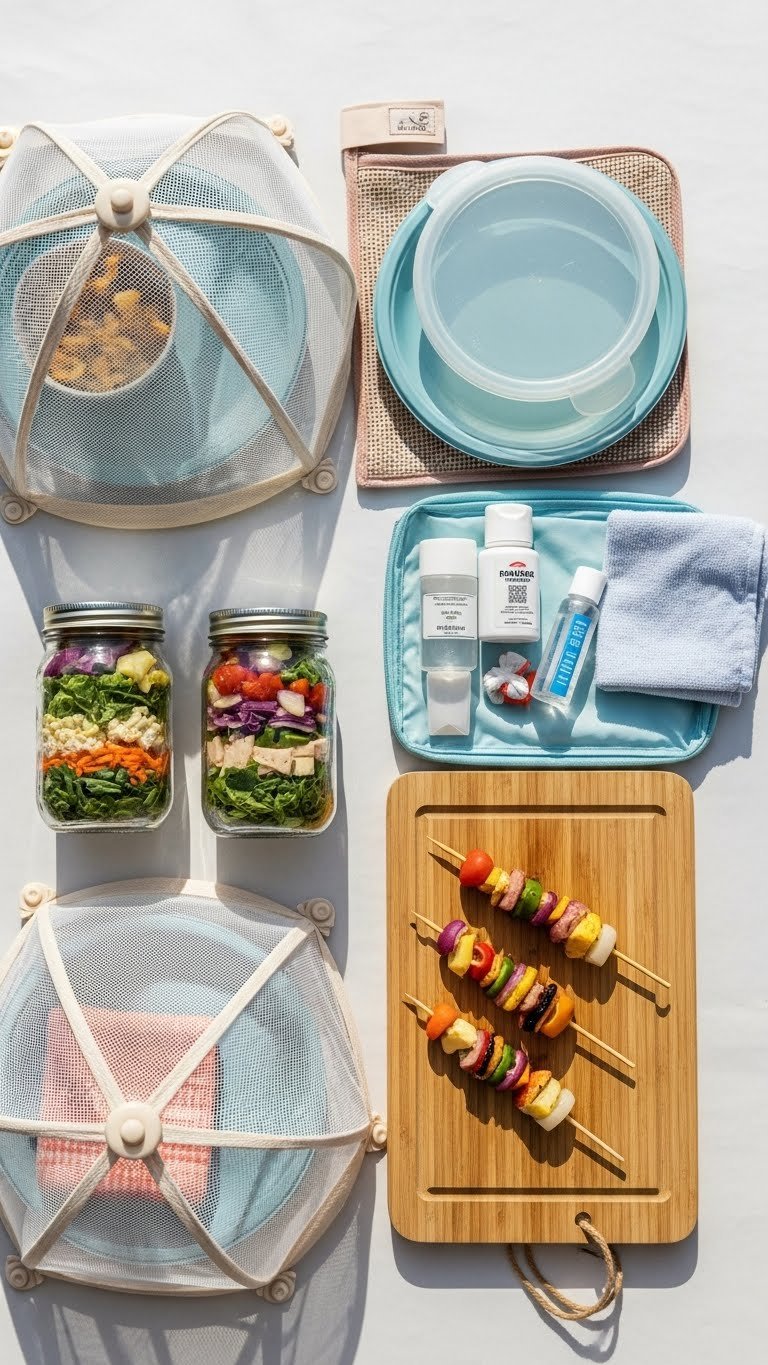 - Mesh food covers and airtight containers (mason jars or BPA-free tubs)